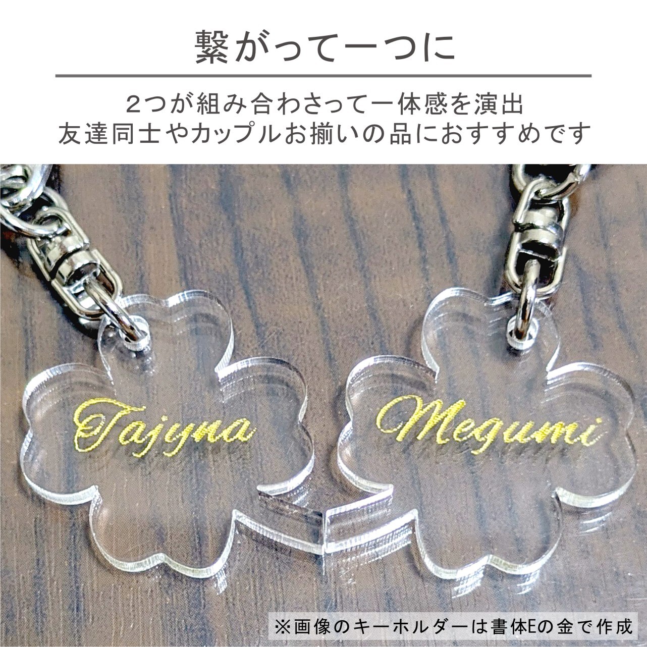 幸運の象徴であるクローバーをかたどった、名入れペアキーホルダー。