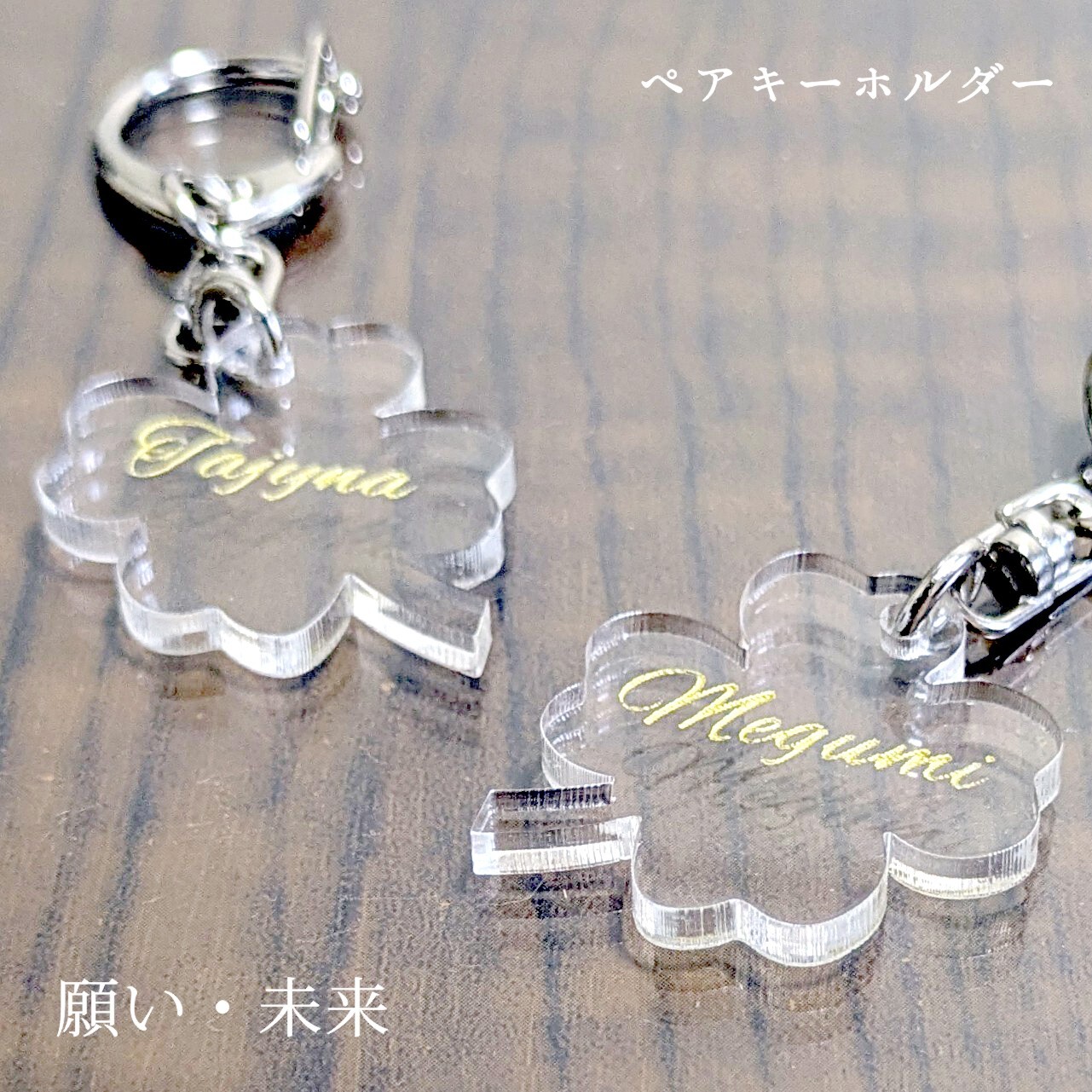 名入れ クリアクローバー ペアキーホルダー 2個セット|刻印金銀・幸運モチーフ