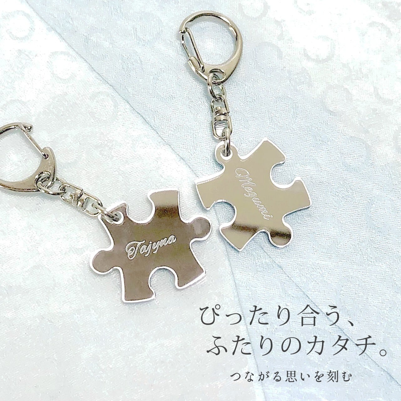 ふたつを並べるとひとつの形になる、パズル型の名入れミラーキーホルダー(2個セット)です。